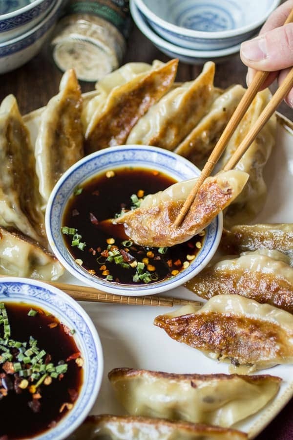 - A la poêle : chauffer un trait d’huile de sésame ou colza dans la poêle. Disposer les gyoza les uns contre les autres en rangs. Laisser griller 2 min, puis ajouter un verre d’eau et couvrir la poêle. L’eau va s’évaporer et finir de cuire les gyoza à la vapeur. Il est de coutume de les retourner dans le plat de service, côté grillé sur le dessus.