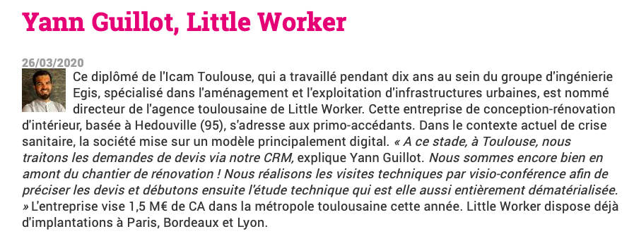 - Et une autre qui met en avant Yann, et l'agence de Toulouse ! https://www.lalettrem.fr/la-lettre-m/yann-guillot-little-worker