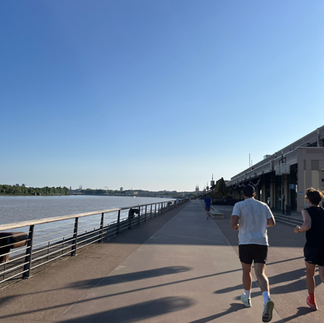 Fraîchement arrivé, Jean-Baptiste a été embarqué par Antoine pour un footing sur les quais — sous 35°C s’il vous plaît ! Heureusement, Margaux assurait le rôle de coach... à vélo, bien installée à l’ombre.