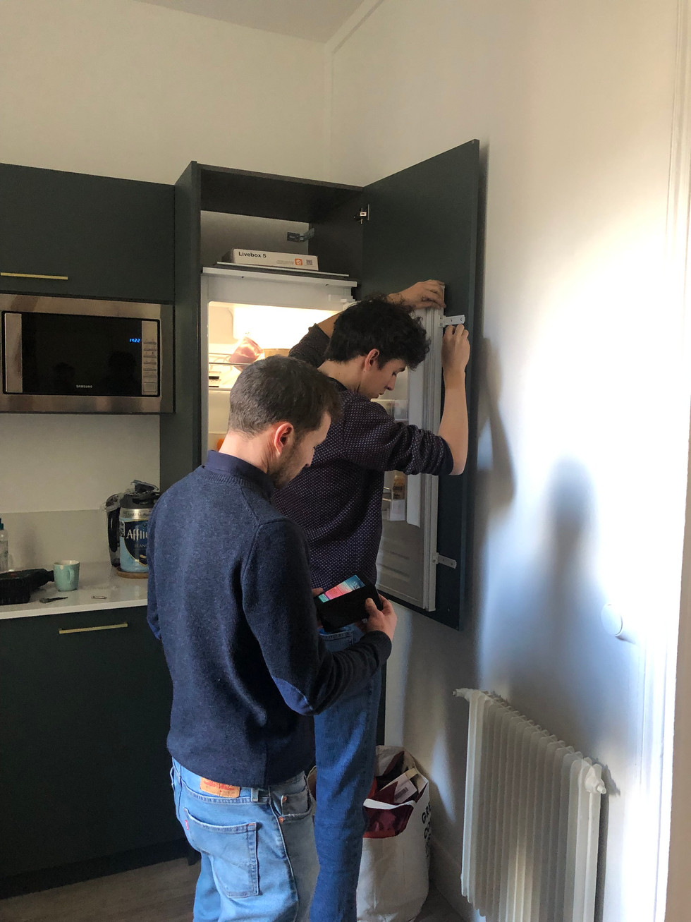 Pendant ce temps là, à Paris, une équipe de pro s'affaire à réparer la glissière de la porte de la belle cuisine ! Disons plutôt qu’ils « finetune » la porte du frigo, pour que nos clients apprécient le geste parfait d’ouverture.